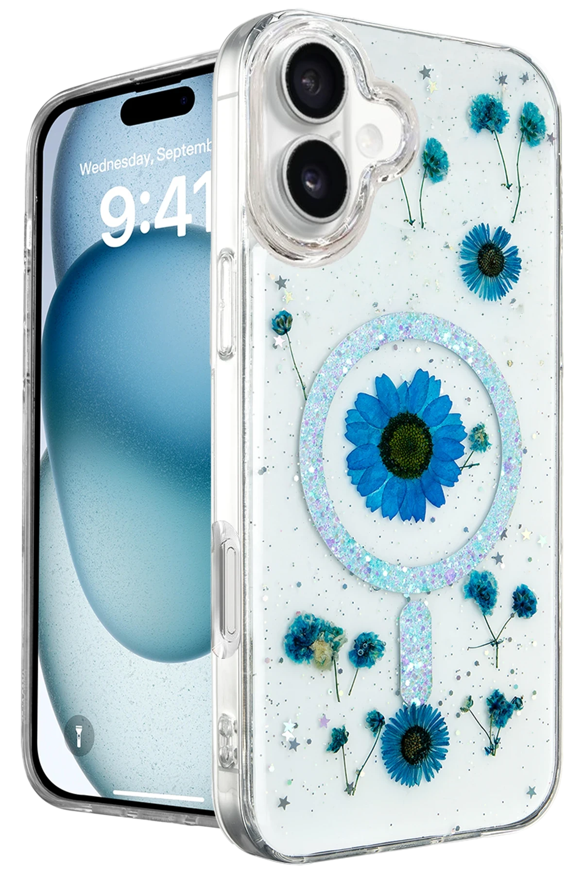 Daisy Simli MagSafe Kapak, doğanın zarafetini ve sadeliğini yansıtan, içinde gerçek çiçeklerin bulunduğu eşsiz bir tasarıma sahiptir. Kapak, içindeki gerçek papatya çiçekleri ve simli arka planı ile cihazınıza doğal bir güzellik katarken, her kapak kendi içinde benzersizdir. Bu, telefonunuzu hem korurken hem de ona kişisel bir dokunuş ekler.